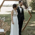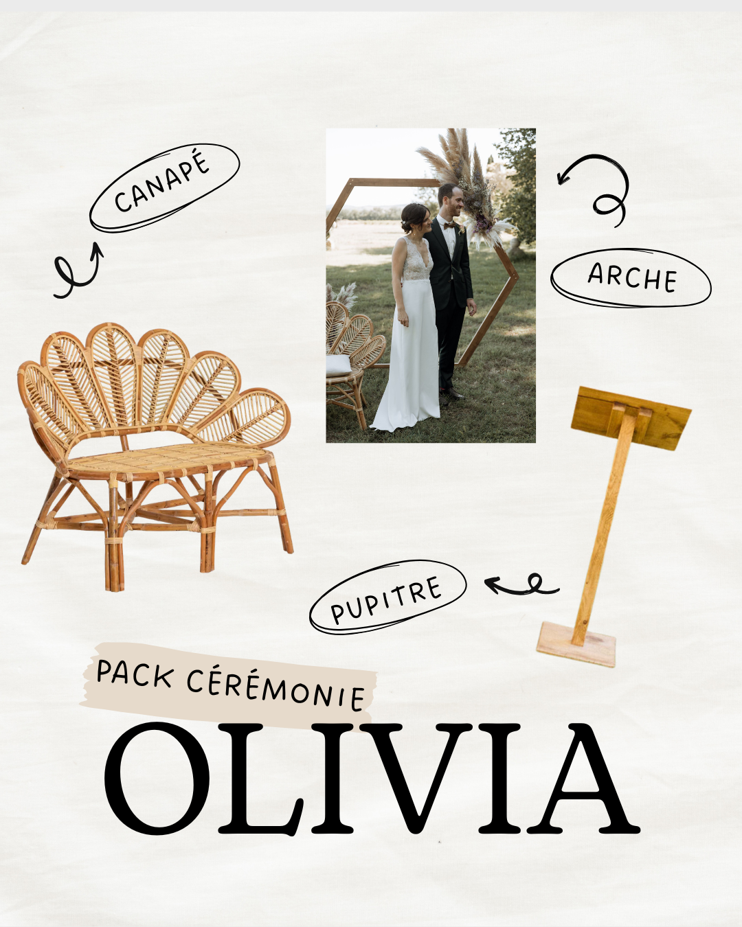 Structure moderne et élégante, parfaite pour encadrer l’échange des vœux et créer un point focal fort.1 canapé en rotin style paon